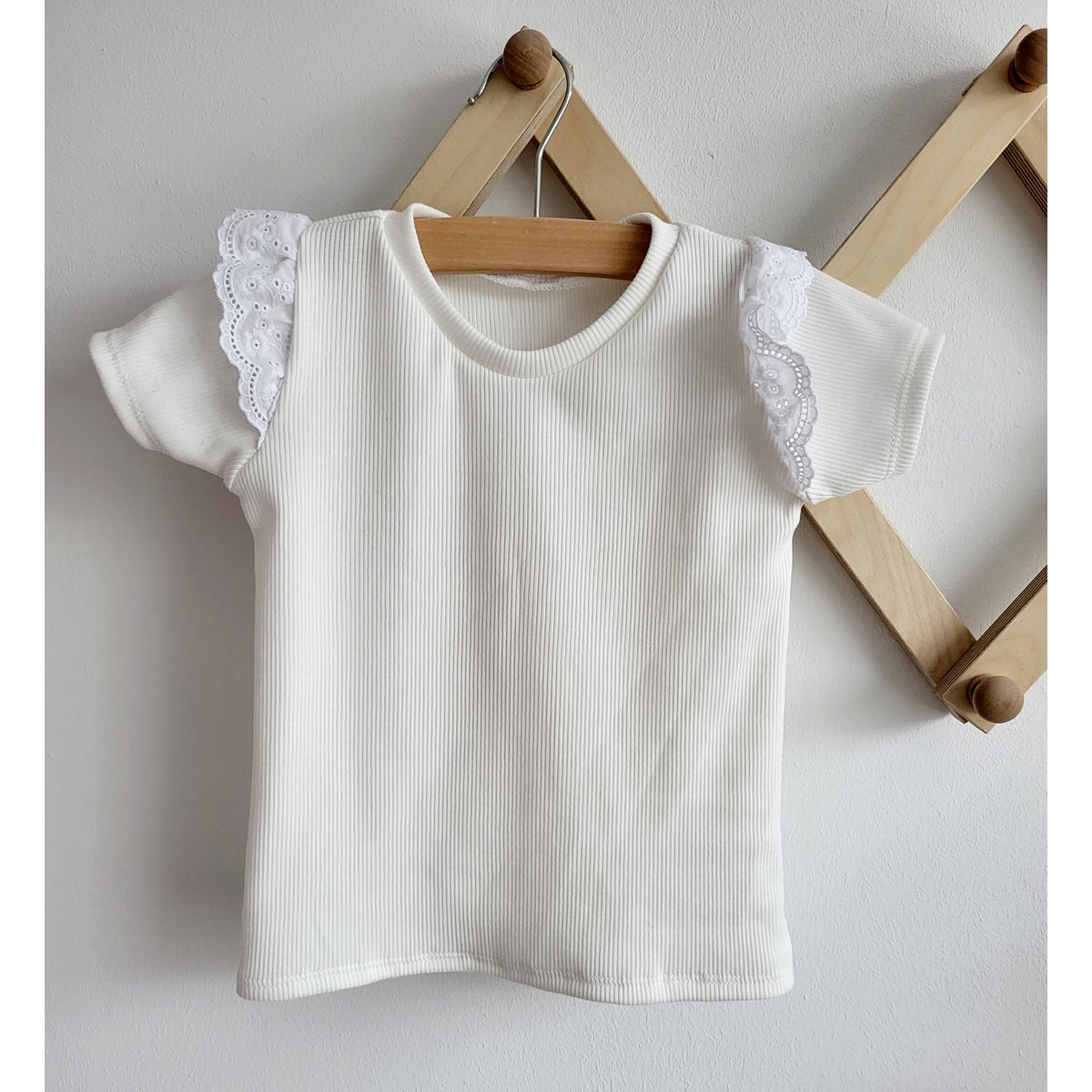 Deze top met korte mouwen is een fijne basic om in de kast te hebben hangen want deze past bij ontzettend veel prachtige broekjes. Deze ecru korte mouwen top is gemaakt van een zachte en soepele rib stof. En is afgewerkt met een vrolijke, girly kanten ruffle op de schouder.